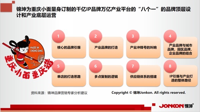 在經(jīng)過與重慶市、大渡口區(qū)兩級(jí)政府以及相關(guān)委辦局、本地規(guī)上企業(yè)和外地頭部企業(yè)、相關(guān)消費(fèi)者以及各類合作商、渠道商和服務(wù)商的大量調(diào)研、研究論證和座談分析后,錦坤品牌專家為重慶小面量身訂制了千億IP品牌萬億產(chǎn)業(yè)平臺(tái)的“八個(gè)一”的品牌頂層設(shè)計(jì)和產(chǎn)業(yè)底層運(yùn)營(yíng),“六方”(政產(chǎn)商智媒資)合力、“七化”(品牌化、樣板化、連鎖化、產(chǎn)業(yè)化、標(biāo)準(zhǔn)化、資本化和城市化)運(yùn)作和“八產(chǎn)”(文旅農(nóng)食餐零金科)聯(lián)動(dòng),在重慶市委市政府的高度重視和大渡口區(qū)委區(qū)政府的全面推動(dòng)下,成為推動(dòng)重慶市名片引爆和大渡口產(chǎn)業(yè)打造的超級(jí)新引擎,已在全國(guó)全球范圍內(nèi)擁有30多萬家小店的重慶小面,正向千億營(yíng)收萬億產(chǎn)業(yè)發(fā)起沖擊!