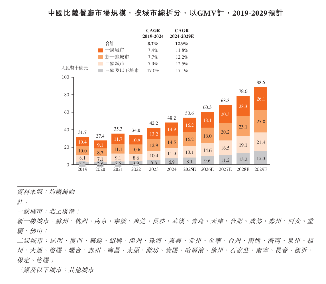 同樣據(jù)灼識咨詢數(shù)據(jù),中國披薩餐廳市場規(guī)模于2019年的317億元增長至2024年的482億元,預(yù)計(jì)2024年至2029年的復(fù)合年增長率達(dá)12.9%,于2029年達(dá)到人民幣885億元。