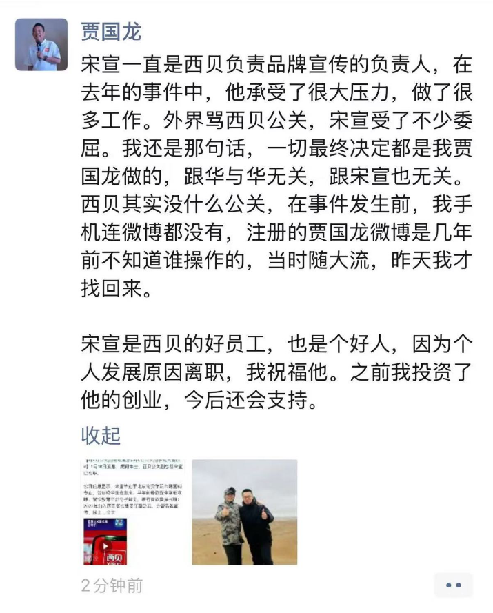 即使前腳“西貝從來就沒有什么公關”“我為什么要懂公關?”的賈國龍,在后腳面對西貝公關副總裁宋宣宣布離職的時候,還是濃濃的愛與關懷。