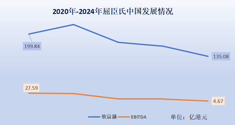 事實上,從2020年開始,屈臣氏在中國市場的發(fā)展一直處于下滑趨勢,其中EBITDA從2020年的27.59億港元(約合人民幣24.66億元)下滑至2024年的4.67億港元(約合人民幣4.17億元),降幅約為 83.07%。