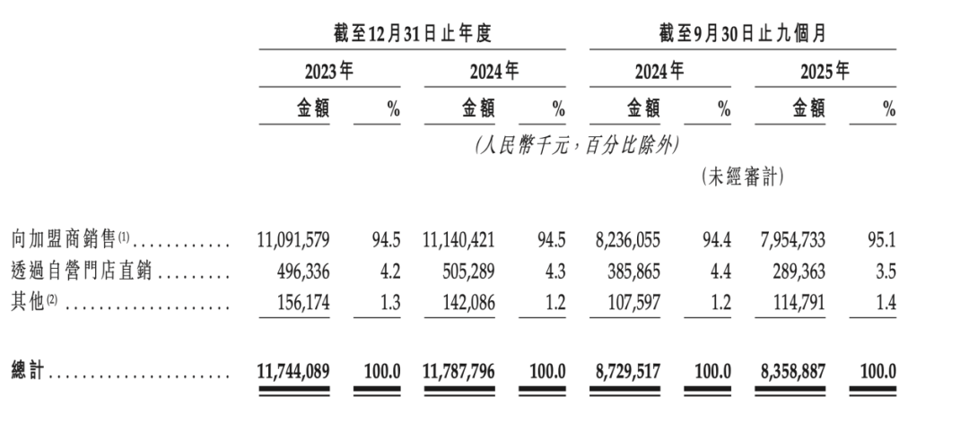 從財務(wù)數(shù)據(jù)來看,錢大媽本質(zhì)也屬于一家服務(wù)于加盟商的供應(yīng)鏈公司。以2024年財報為例,公司總營收錄得117.88億元,其中向加盟商的銷售金額高達111.4億元(剔除加盟費及特許權(quán)使用費收入后,純商品銷售約為109.71億元),占比呈壓倒性優(yōu)勢。相比之下,直營門店的銷售額僅為5.05億元。這一營收結(jié)構(gòu)與當年門店分布一致:在全2922家門店中,加盟店多達2863家,是絕對的市場主力。