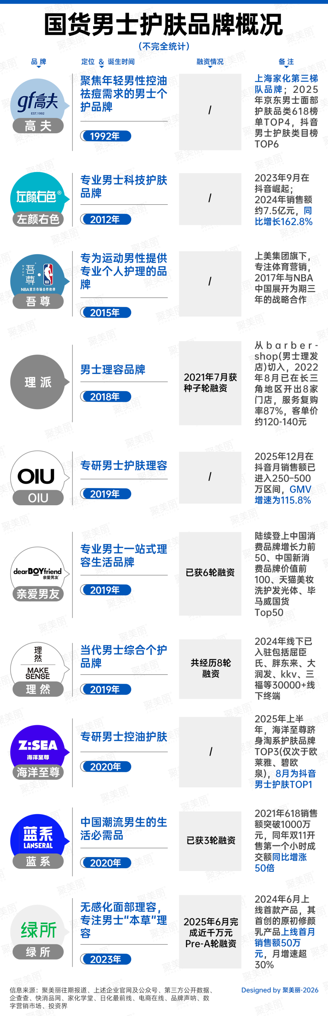 另一方面,雖然高夫曾在2016年居于男士護膚排行榜第五名,且在這前十中名中外資品牌話語權(quán)更強。但這并不意味著,國貨男士護膚品牌十年間無進一步發(fā)展,聚美麗梳理了國貨男士護膚品牌的概況,發(fā)現(xiàn)有不少男士護膚品牌誕生在2018、2019年間,彼時正處于新銳品牌狂飆期,一些乘風而起的男士護膚品牌也獲得了資本青睞。