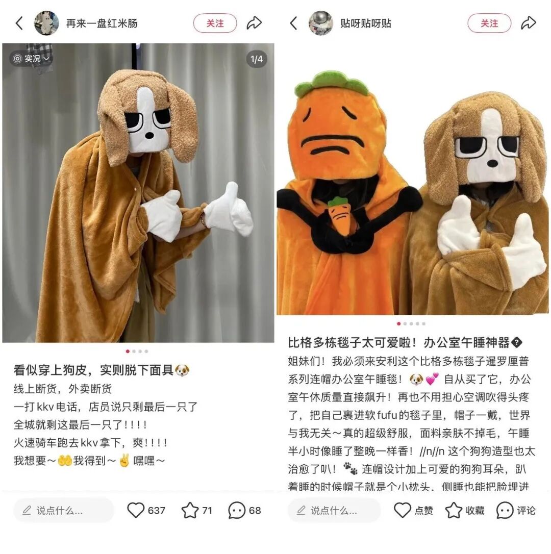 除了上文提到的“章魚哥陪睡”“比奇堡的居民們演我一天”系列外,社交媒體上,KKV與暹羅厘普共創(chuàng)的連帽午睡毯·出門扮狗咯系列產(chǎn)品,也曾引發(fā)了全網(wǎng)COS熱潮。這些產(chǎn)品自帶“社交屬性”,在社交媒體上引發(fā)了大量的二創(chuàng)互動(dòng)。這種邏輯下,產(chǎn)品不再是冰冷的物件,而是年輕人情緒表達(dá)的載體。