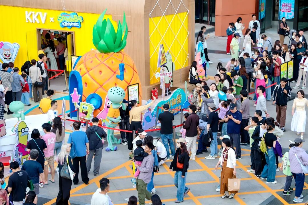 在與海綿寶寶的聯(lián)名快閃當(dāng)中,KKV通過1:1復(fù)刻經(jīng)典動(dòng)畫場景,將蟹堡王餐廳、菠蘿屋、石像屋等標(biāo)志性建筑群以極具視覺沖擊感的巨物裝置方式呈現(xiàn),高度還原動(dòng)畫美術(shù)風(fēng)格,同時(shí)設(shè)置石像屋限定拍照機(jī)、章魚哥人偶國內(nèi)線下見面會(huì)首秀、80+款首發(fā)周邊等多重差異化的互動(dòng)活動(dòng),給予消費(fèi)者立體沉浸式的交互式體驗(yàn)空間,現(xiàn)場人流如織,引發(fā)打卡熱潮。