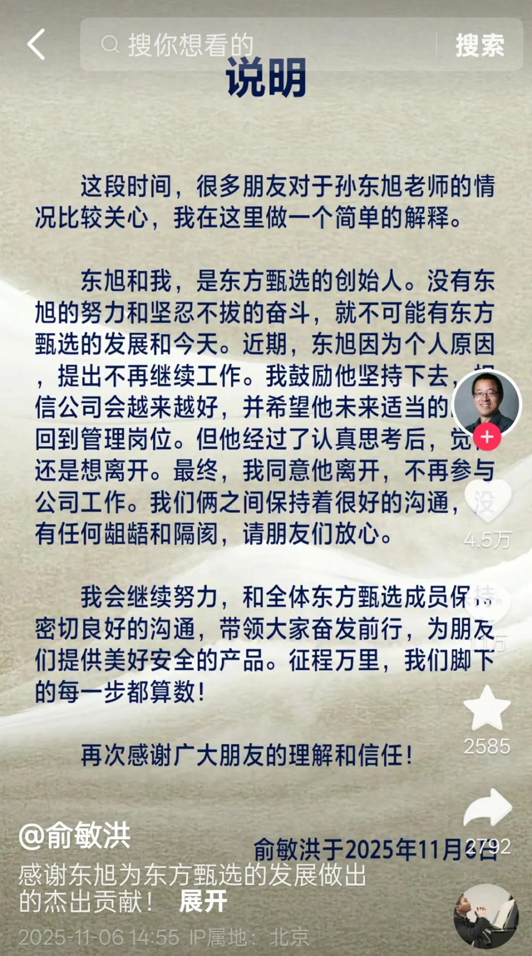 俞敏洪隨后在社交平臺發(fā)文回應,稱“東旭和我是東方甄選的創(chuàng)始人,沒有東旭的努力和堅忍不拔的奮斗,就沒有東方甄選的發(fā)展和今天”,并透露孫東旭因個人原因提出離職,經(jīng)反復溝通后,他最終同意了對方的請求。