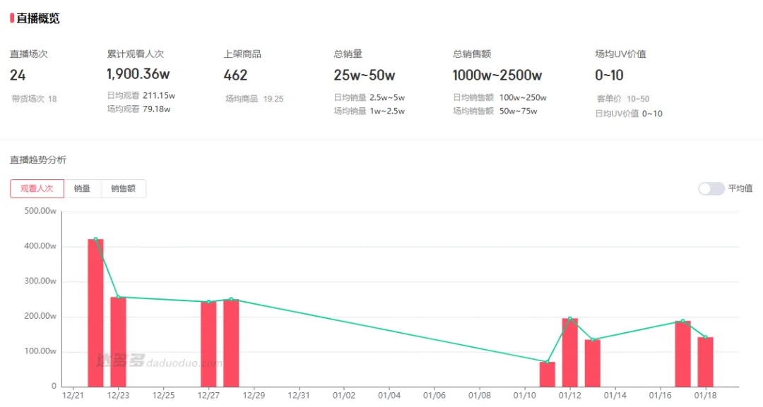 第三方數(shù)據(jù)顯示,該賬號近30天直播24場,其中帶貨場次18場,觀看人次達1900.36萬,帶動總銷售額在1000萬至2500萬元之間。
