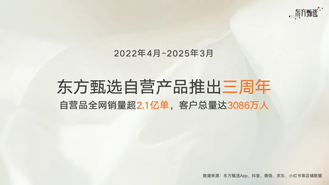 今年3月,東方甄選宣布,自2022年4月推出自營產(chǎn)品以來,其在售品類已超400款,全網(wǎng)累計銷量突破2.1億單,客戶總數(shù)達3086萬人。