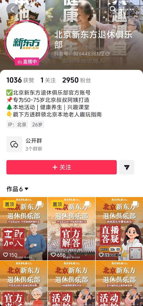 近日,“北京新東方退休俱樂部”賬號在抖音、小紅書等社交平臺正式亮相。