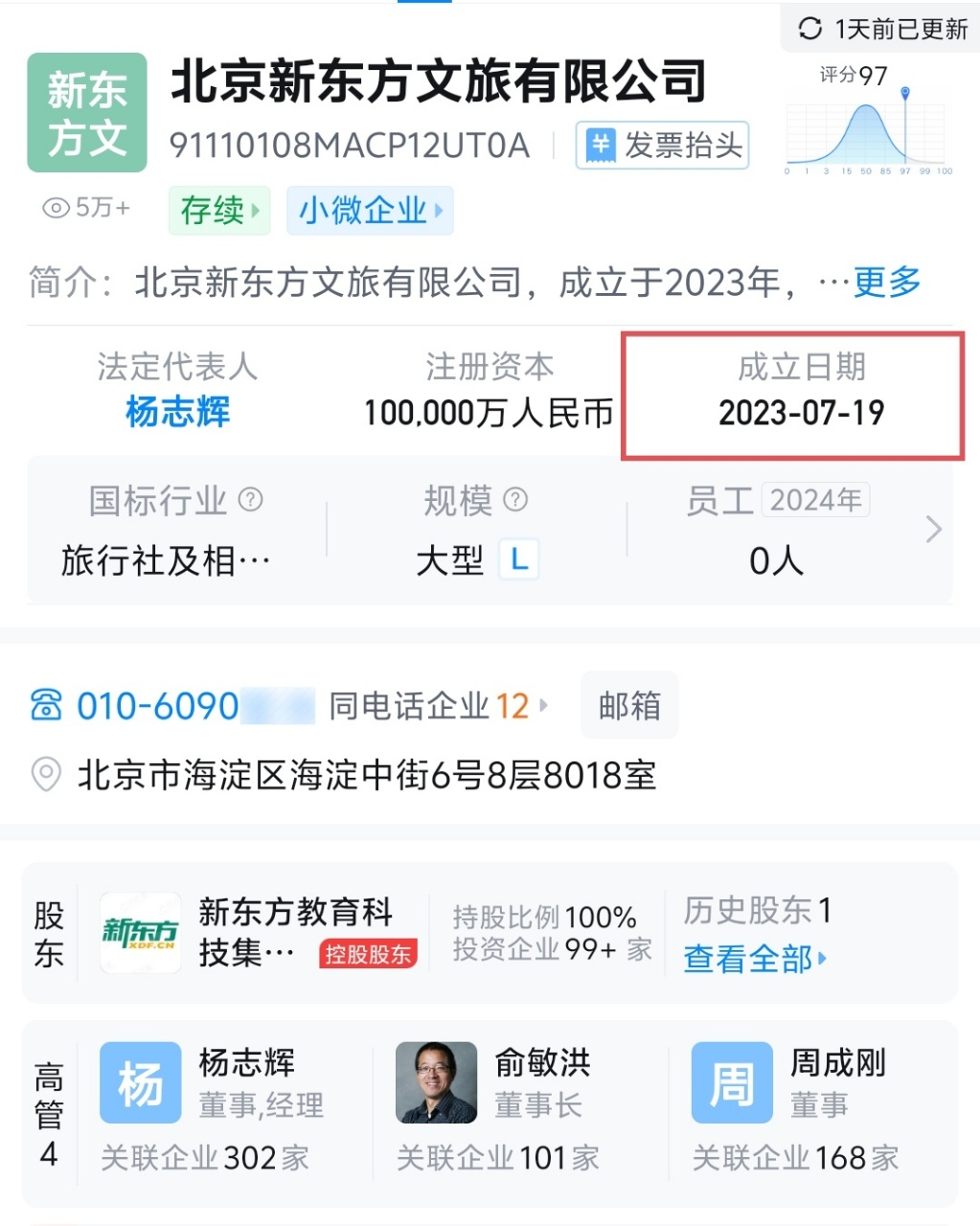 天眼查App顯示,新東方全資子公司北京新東方文旅有限公司于2023年7月19日成立,注冊資本10億元,俞敏洪任董事長,經(jīng)營范圍含旅游業(yè)務、旅游開發(fā)項目策劃咨詢等,足見其對文旅業(yè)務的重視程度。