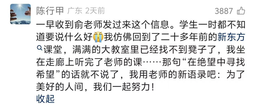 對此,陳行甲在評論區(qū)回復,疑似確認接受邀約。他難掩激動,坦言“一早收到俞老師發(fā)過來這個消息,學生一時都不知道要說什么好”,字里行間滿是驚喜與動容,隨后表態(tài)“為了美好的人間,我們一起努力!”,為新東方的未來發(fā)展增添了新的想象空間與期待。
