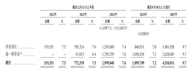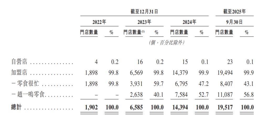 招股書(shū)數(shù)據(jù)顯示,截至2022年底,“零食很忙”門(mén)店為1902家;通過(guò)收購(gòu)趙一鳴后,“零食很忙+趙一鳴”合計(jì)門(mén)店數(shù)在2023年底達(dá)到6585家;到2024年底,這一數(shù)字進(jìn)一步擴(kuò)張到1.4萬(wàn)家;截至2025年9月30日,兩大品牌合計(jì)門(mén)店達(dá)到1.9萬(wàn)家,其中零食很忙8419家,趙一鳴1.1萬(wàn)家。