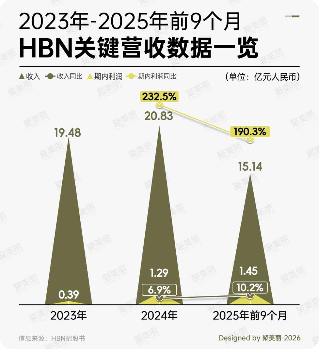 結(jié)合其招股書披露的關(guān)鍵營收數(shù)據(jù)來看,2023年、2024年、2025年前9個(gè)月,HBN的營收分別為19.48億元、20.83億元、15.14億元,值得注意的是,2024年、2025年前9個(gè)月同比增長分別為6.9%、10.2%?梢钥吹剑鳛橐粋(gè)年輕的國貨品牌,近年來HBN業(yè)績保持了較為穩(wěn)健的增長。