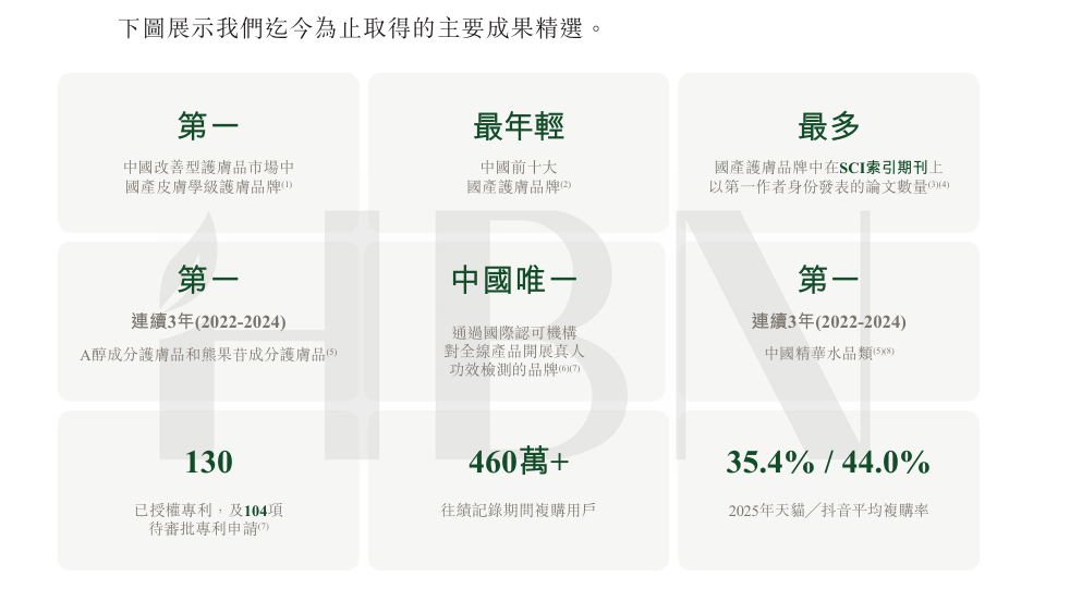 另外,據(jù)招股書顯示,截至2025年9月30日,HBN研發(fā)團(tuán)隊(duì)共有103名專業(yè)人員,其專業(yè)領(lǐng)域涵蓋皮膚學(xué)、醫(yī)學(xué)、細(xì)胞生物學(xué)與合成生物學(xué)等,以實(shí)現(xiàn)跨學(xué)科協(xié)同創(chuàng)新;根據(jù)灼識(shí)咨詢報(bào)告,國產(chǎn)護(hù)膚品牌中HBN在SCI索引期刊上以第一作者身份發(fā)表的論文數(shù)量位列第一;也是中國唯一通過國際認(rèn)可機(jī)構(gòu)對(duì)全線產(chǎn)品開展真人功效檢測(cè)的品牌。