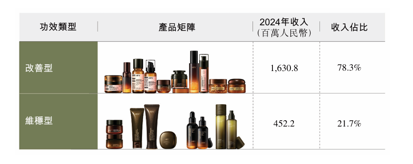 在此次HBN披露的招股書中指出,根據(jù)功效目的的不同,護(hù)膚品可分為改善型護(hù)膚品與維穩(wěn)型護(hù)膚品兩類。其中,改善型護(hù)膚可改善特性肌膚問題,如皺紋、色素沉著、暗沉及松弛,其主要功效宣稱包括抗皺、緊致、祛斑、美白提亮等改善型功能;而維穩(wěn)型護(hù)膚品可保持肌膚基本健康,主要功效宣稱包括清潔、保濕、修護(hù)、舒緩、防曬等基本護(hù)理功能。