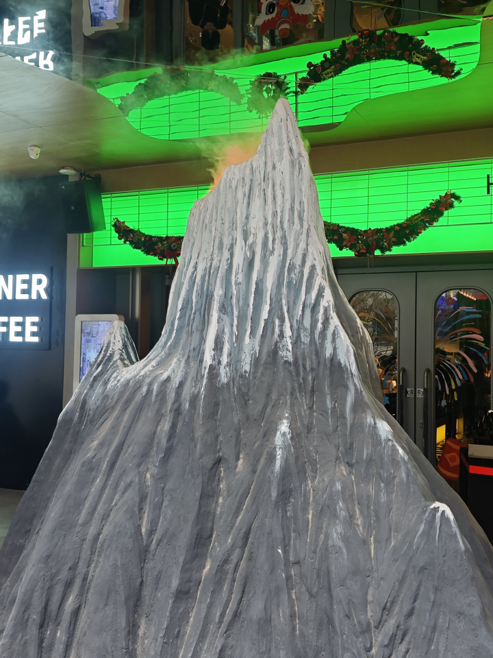 進入空間,首先映入眼簾的是一座大型灰色仿真火山模型,火山口似有煙霧繚繞,雕塑感十足。其下方環(huán)繞著深綠色弧形卡座,構成一個具有包裹感與主題性的半私密社交區(qū),視覺沖擊力強,自然成為打卡焦點。