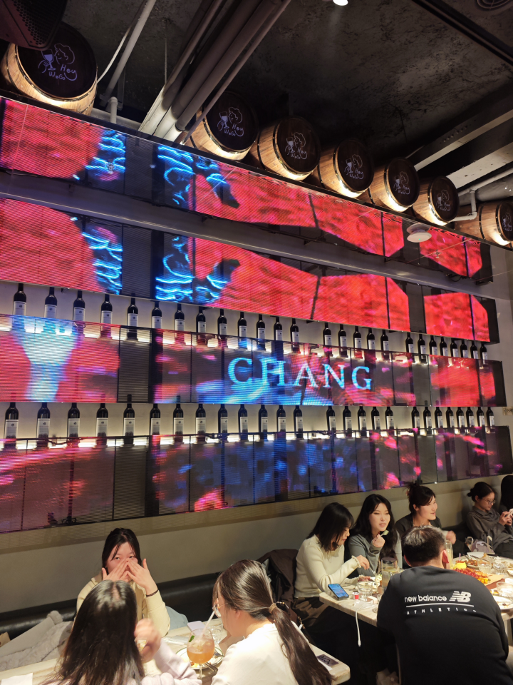 如整面墻由多塊電子屏幕組成,動態(tài)播放著色彩鮮艷的畫面(可見“CHANG”等品牌標識),科技感與藝術感十足。