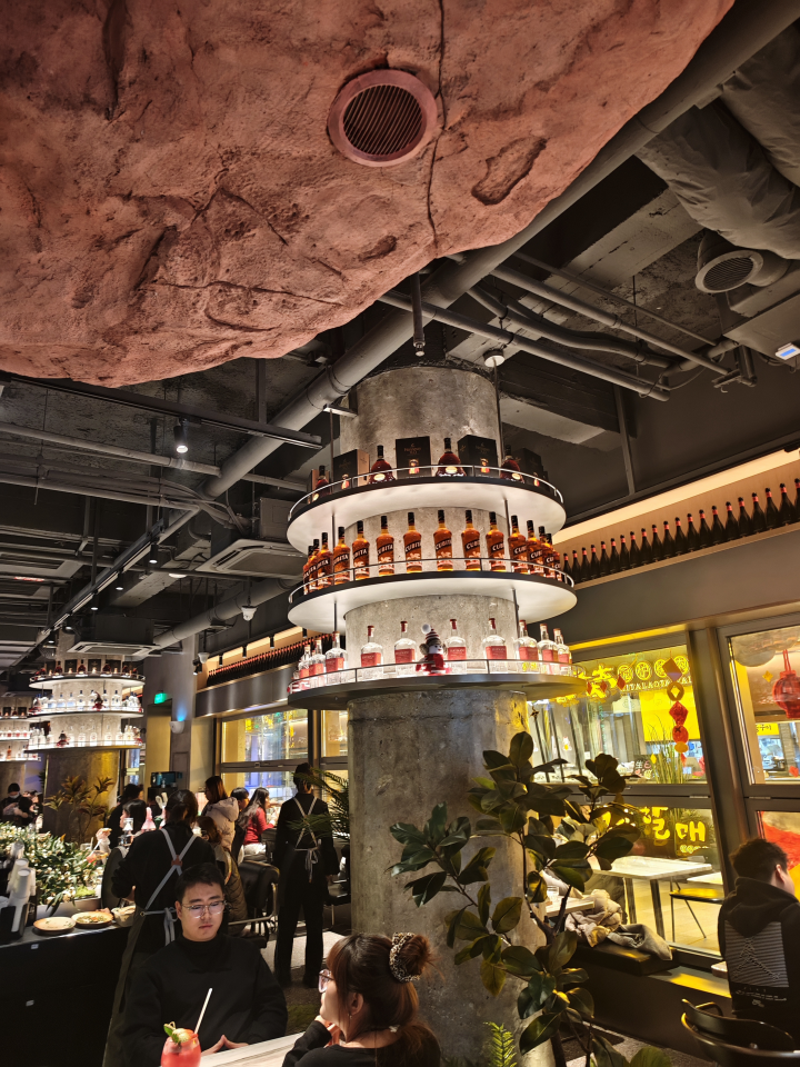 空間中央設有多層圓柱形裝飾酒柱,上面錯落擺放酒瓶,并點綴戴紅白條紋帽的玩偶,在聚光燈下成為視覺焦點與動線的自然引導。