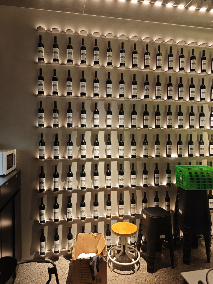 此外,整面墻被用作紅酒瓶的倉儲式陳列架,酒瓶水平密集排列,形成一個巨大的、規(guī)整的深色矩陣內容以整體呈現(xiàn)。