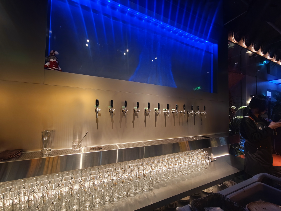 精釀啤酒墻:與主吧臺呼應的是專業(yè)精釀啤酒墻,十余個啤酒龍頭整齊排列,背景為動態(tài)LED大屏,播放藍色光點瀑布等畫面,科技感與藝術感交融,為精釀品飲增添沉浸體驗。