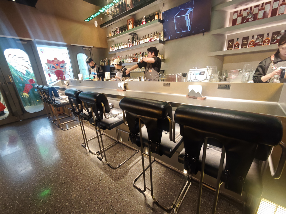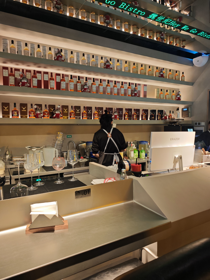 主吧臺區(qū):超長銀色金屬主吧臺貫穿空間,搭配黑色高腳皮椅,后方是通天酒架,琳瑯酒瓶在燈光下熠熠生輝!癇istro”綠色霓虹燈牌點綴其上,復古而潮酷,此處既是調酒師的舞臺,也適合獨酌或快速小酌。