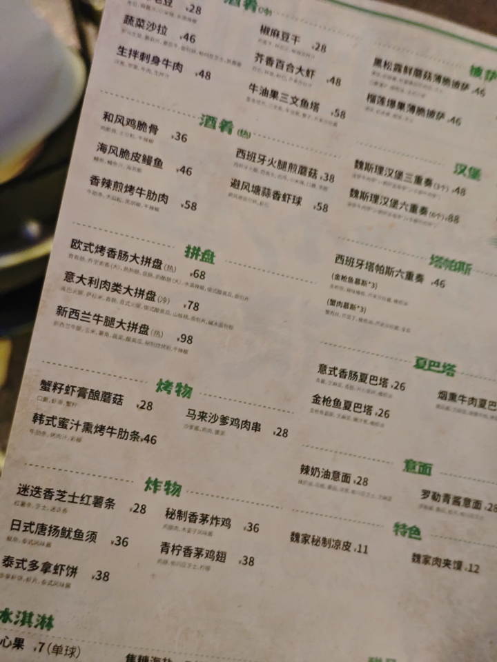 在保留魏家涼皮、肉夾饃等經典小吃并做小份化升級以穩(wěn)固品牌根基的同時,大量引入披薩、迷你漢堡、意面、沙拉等西式品類,SKU總數(shù)約80個。產品明確區(qū)分為冷食(出餐快、不干擾交談)與熱食(適合分享),高度契合酒館聚會的節(jié)奏與氛圍。