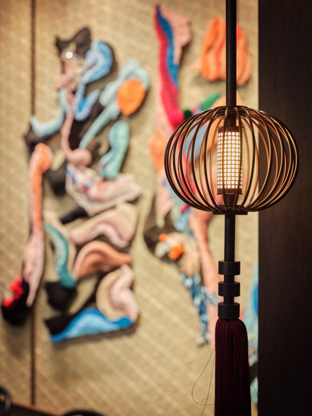 值得一提的是,藤編非遺傳承者陳艷秋女士打造的《藤鱗戲韻》,以騰沖天然老藤為材,用“錯(cuò)縫疊壓法”編織出魚(yú)鱗韻律,作品中的復(fù)古紅既呼應(yīng)粵劇戲臺(tái),又契合深烘咖啡豆的醇厚色澤,成為空間中不動(dòng)聲色的匠心點(diǎn)綴。此外,由藝術(shù)家設(shè)計(jì)創(chuàng)作的《粵韻成章》,以拼貼技藝織就“睇戲”二字,金線珠片與龍紋鳳繡隱現(xiàn)其間,讓粵韻之美在細(xì)節(jié)中流轉(zhuǎn)。
