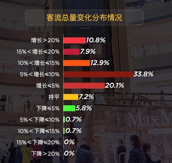 從經(jīng)營核心維度看,客流的強勢回歸成為復(fù)蘇的先行信號:85.5% 的項目實現(xiàn)客流增長,其中33.8%的項目增幅集中在5%-10%區(qū)間,購物中心作為線下社交與體驗載體的價值持續(xù)凸顯,為后續(xù)消費轉(zhuǎn)化筑牢了基礎(chǔ)。