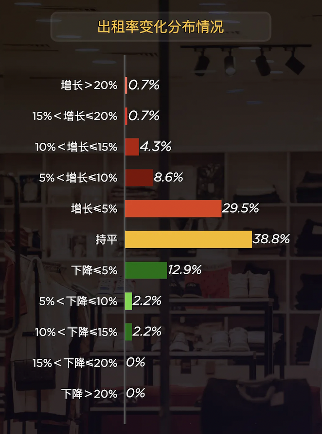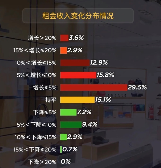 租金表現(xiàn)則延續(xù)了 “微增為主” 的特征:64.7%的項目租金收入實現(xiàn)增長,但超四成屬于≤5%的微增,增長超10%的項目合計僅19.4%,同時仍有二成項目面臨租金下滑的壓力,增收與品牌留存的平衡成為企業(yè)的核心命題。