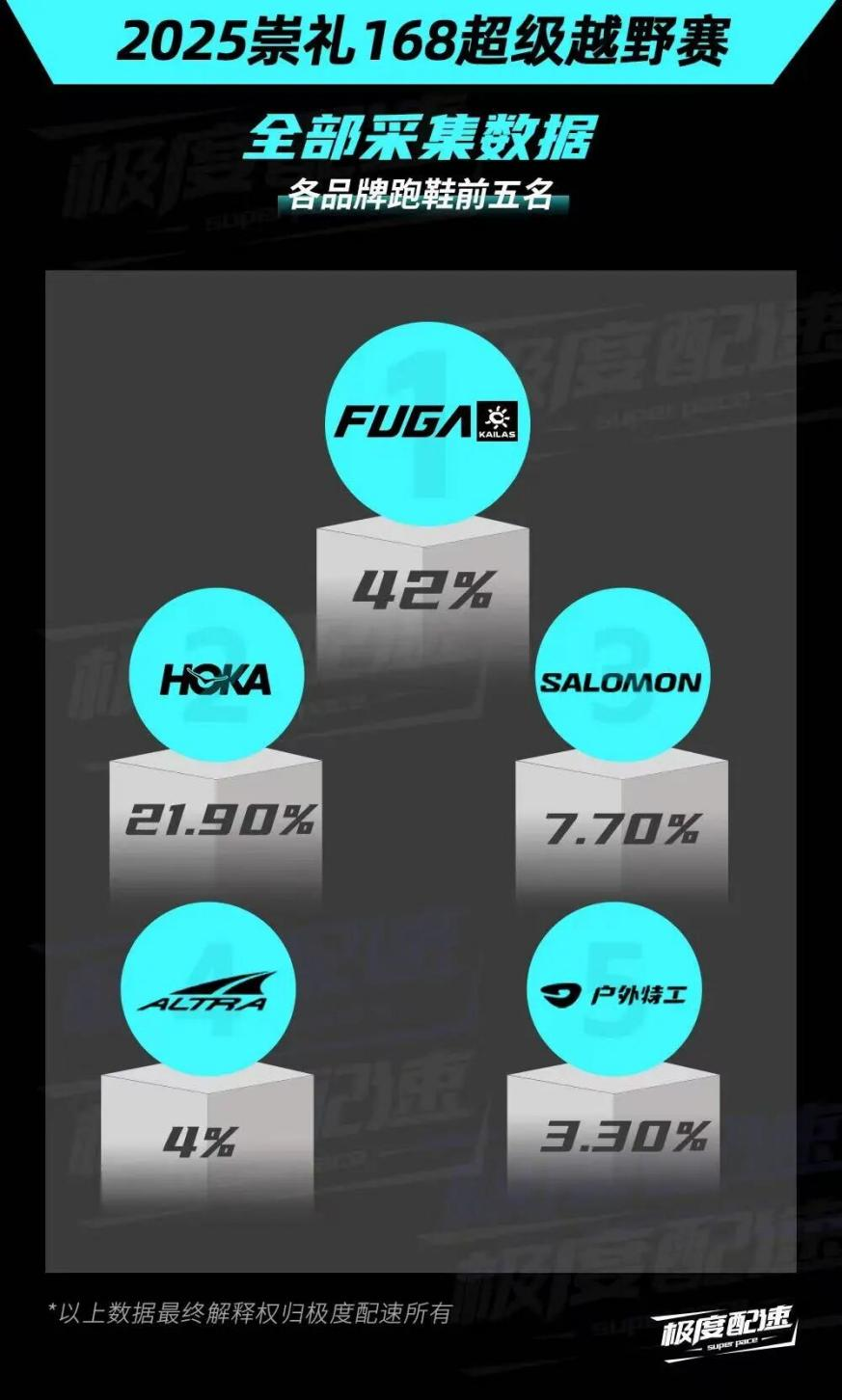 2025年,在亞洲規(guī)模最大的單場(chǎng)越野賽事崇禮168上,凱樂(lè)石品牌的上腳率達(dá)到驚人的42%,HOKA和薩洛蒙分列第二第三,上腳率分別是21.9%和7.7%。盡管號(hào)稱“越野跑三巨頭”,但薩洛蒙的占有率與前兩名存在成倍的差距。