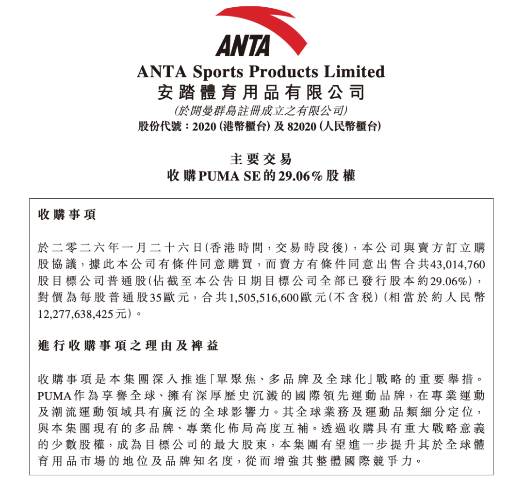 1月27日,安踏發(fā)布公告稱,其與Pinault(皮諾)家族的投資公司Groupe Artémis達成協(xié)議,收購運動品牌Puma所屬公司29.06%的股權,現(xiàn)金對價為15億歐元(約合人民幣124.42億元)。
