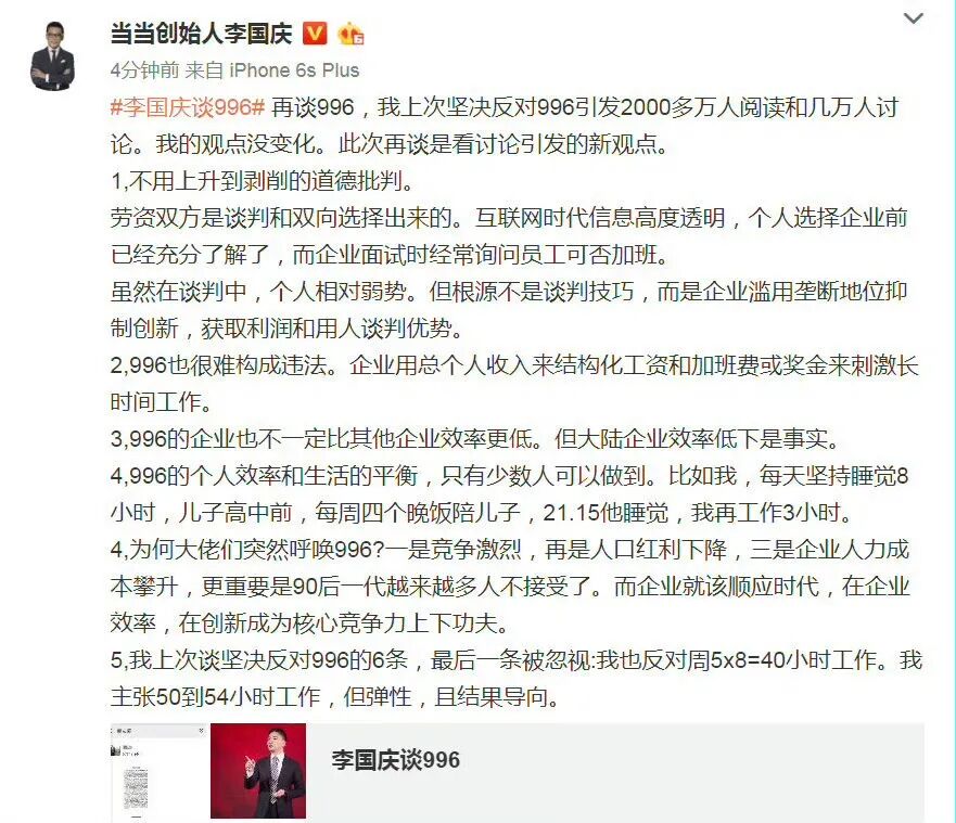當(dāng)初馬云說“996是福報(bào)”引發(fā)全網(wǎng)炸鍋后,當(dāng)當(dāng)網(wǎng)創(chuàng)始人李國慶還曾多次公開反對996。