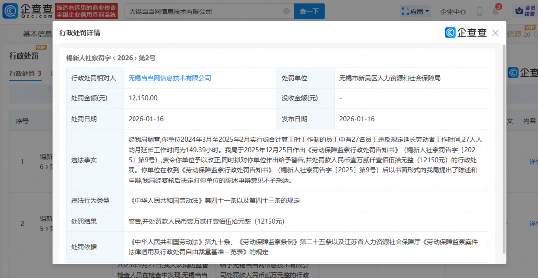 日前披露的一則處罰信息顯示,無錫當(dāng)當(dāng)網(wǎng)信息技術(shù)有限公司因違反勞動(dòng)法相關(guān)規(guī)定,被當(dāng)?shù)厝松缇痔幰跃娌⒘P款12150元。