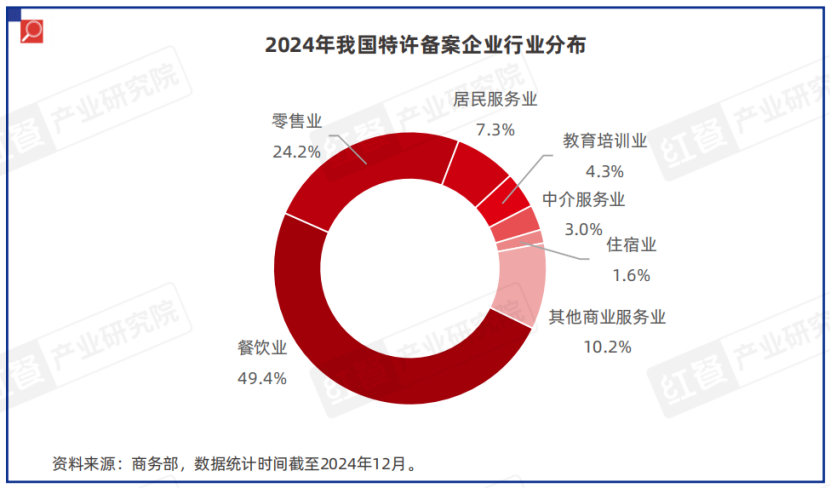 從中國加盟企業(yè)的行業(yè)結構來看,據(jù)商務部數(shù)據(jù),餐飲業(yè)占比近五成,是加盟市場的主力賽道。同時,加盟模式滲透至多元業(yè)態(tài)。其中,零售業(yè)是第二大行業(yè),占比為24.2%,居民服務業(yè)、教育培訓業(yè)等其他行業(yè)占比則相對較少。