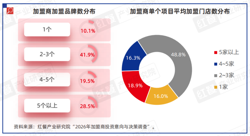 從經營布局來看,多品牌布局已成為加盟行業(yè)普遍策略。紅餐產業(yè)研究院調研發(fā)現(xiàn),近90%的加盟商同時布局了2個及以上品牌。從門店數(shù)量維度來看,單項目門店擴張集中度較低,僅48.8%的加盟商在單個項目中布局2~3家門店,單項目門店擴張的集中度相對較低。