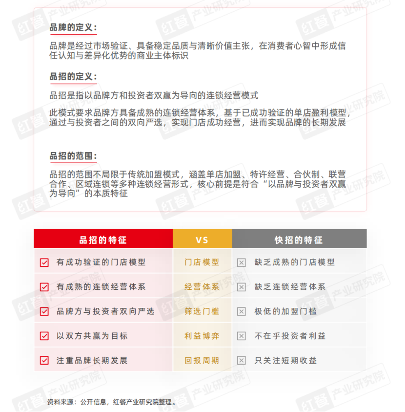其次,在加盟模式方面,“快招”模式逐步出清,行業(yè)向品招模式轉型。我國的連鎖加盟行業(yè)在發(fā)展的過程中,出現(xiàn)了一些加盟亂象,其中“快招”品牌的“割韭菜”行為,給整個加盟行業(yè)的發(fā)展帶來了負面影響,使得真正有實力、有誠意的品牌在拓展市場時面臨更大的挑戰(zhàn),行業(yè)迫切需要完善優(yōu)質項目的標準和特征。