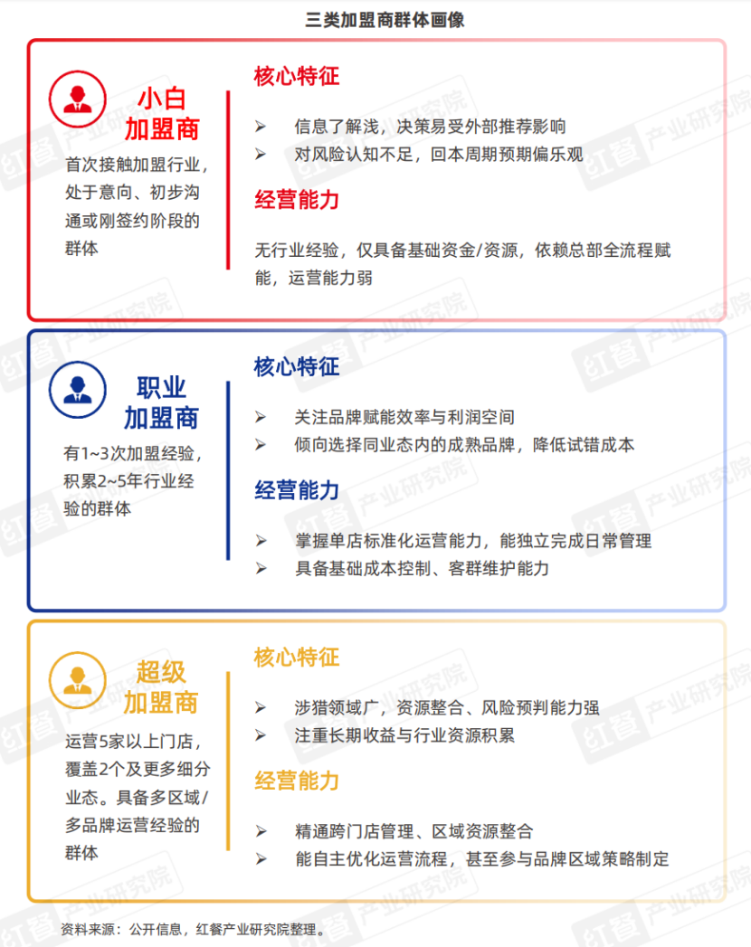 目前,連鎖加盟行業(yè)的投資者主要由加盟小白、職業(yè)加盟商、超級加盟商三類群體組成,他們在經驗、核心特征和經營能力上存在明顯差異,其中職業(yè)加盟商和超級加盟商通過豐富的經驗、專業(yè)的能力和雄厚的資金實力等能力優(yōu)勢,正在逐漸成為加盟市場主流群體。