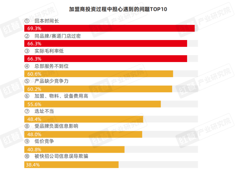 加盟商投資過程中,最擔心引發(fā)投資失敗的三大問題依次為回本時間過長、同品牌/賽道門店密度過密、實際毛利率偏低。