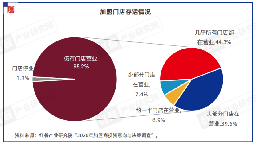 在門店存活狀態(tài)方面,加盟門店的經營狀態(tài)整體較好,行業(yè)內門店存活的基礎盤較為穩(wěn)固,反映出加盟模式在經營持續(xù)性上具備一定優(yōu)勢。據(jù)紅餐產業(yè)研究院調研,僅1.8%的加盟商表示其所有門店已停業(yè),44.3%的加盟商表示其所有門店正常營業(yè),39.6%的加盟商表示其大部分門店處于營業(yè)狀態(tài)。