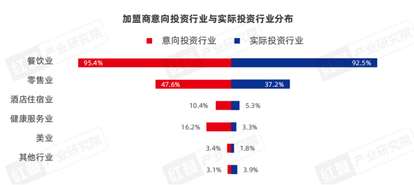 在投資偏好方面,紅餐產業(yè)研究院“加盟商投資意向與決策調查”結果顯示,餐飲行業(yè)是大部分加盟商的選擇,意向投資與實際投資占比分別達到了95.4%和92.5%。