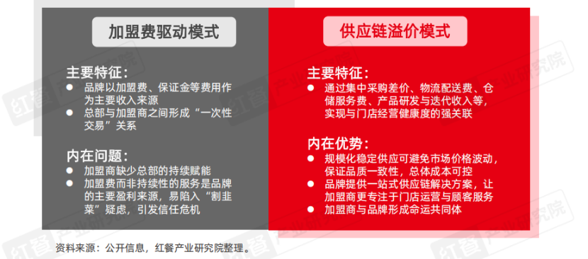 首先,品牌方盈利邏輯已從收加盟費轉向供應鏈溢價。傳統(tǒng)加盟費模式以一次性收費為核心,與加盟商關聯(lián)弱且易存信任風險;新模式則通過集中采購、物流配送等供應鏈服務獲利,與門店經營健康度深度綁定。