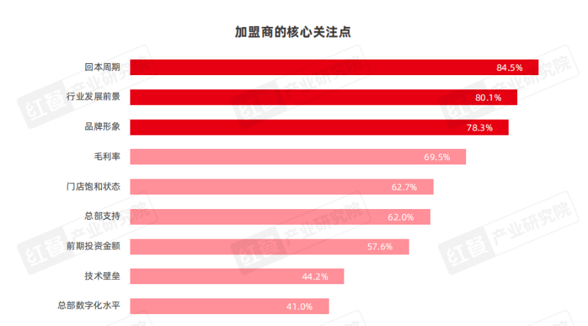 紅餐產業(yè)研究院“加盟商投資意向與決策調查”結果顯示,加盟商在選擇項目時,最看重的三個因素分別為:回本周期、行業(yè)發(fā)展前景、品牌形象,占比分別為84.5%、80.1%、78.3%。