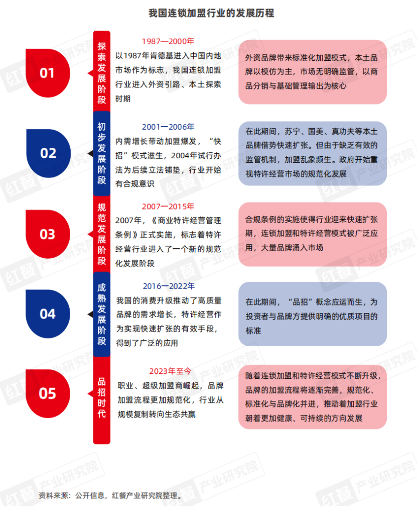 我國的連鎖加盟行業(yè)歷經數(shù)十年發(fā)展,歷經了“探索發(fā)展—初步發(fā)展—規(guī)范發(fā)展—成熟發(fā)展—品招時代”五個階段。當下,行業(yè)正隨著政策、技術與市場需求迭代,逐步實現(xiàn)合規(guī)化、專業(yè)化與生態(tài)化升級。