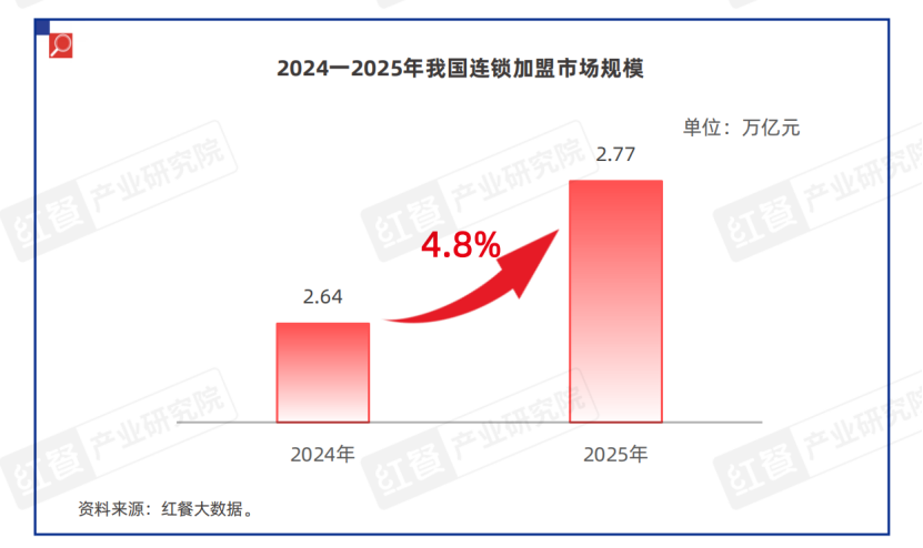 在此背景下,我國連鎖加盟行業(yè)保持著穩(wěn)步擴張的態(tài)勢。據(jù)紅餐產業(yè)研究院測算,2025年,我國連鎖加盟市場規(guī)模約為2.77萬億元,同比增長4.8%。
