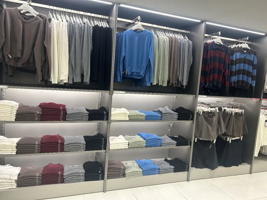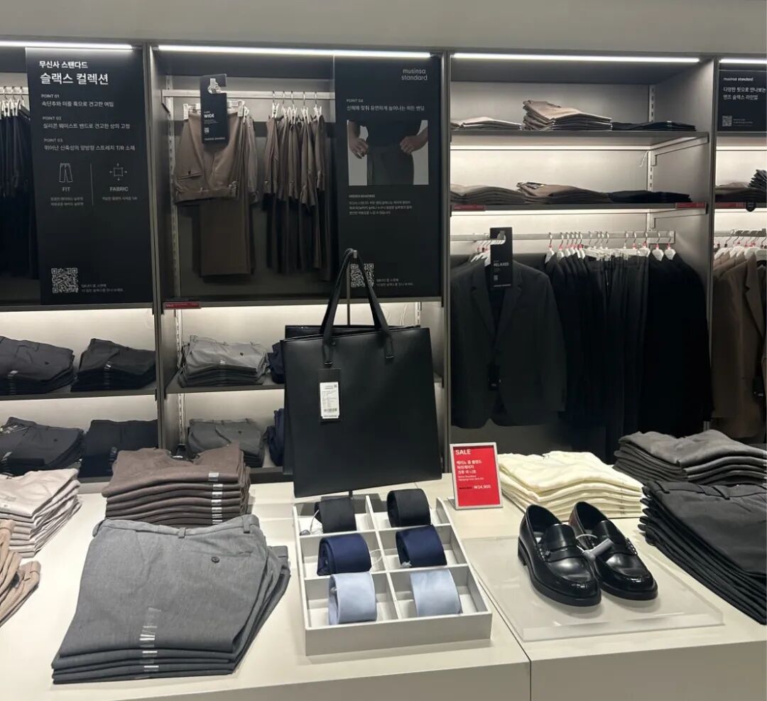 同樣主打無logo基礎(chǔ)款,優(yōu)衣庫的陳列更側(cè)重功能性分類,設(shè)計(jì)更基礎(chǔ),而Musinsa則通過成套風(fēng)格展示替代傳統(tǒng)單品陳列,提升逛店效率,強(qiáng)調(diào)“韓女穿搭”的氛圍感,簡單卻經(jīng)得起多場(chǎng)景疊穿。