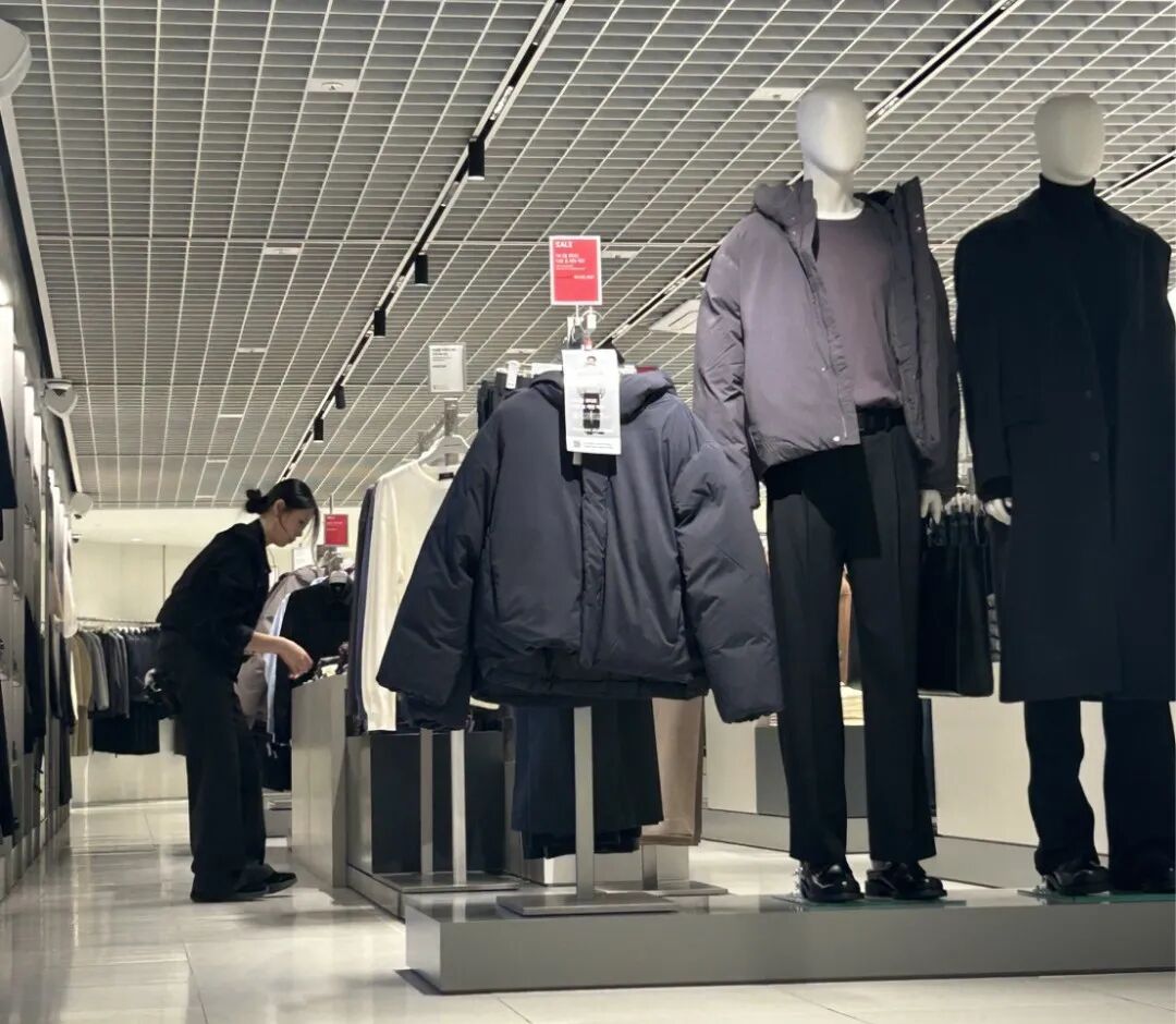 日均客流量超50萬人次的上;春V新方謪^(qū),成為Musinsa Standard撬動(dòng)中國市場(chǎng)的首站。巨大的落地櫥窗里,代言人韓素希身著羽絨服的海報(bào)十分搶眼,選擇核心商圈開設(shè)1400多平方米大旗艦店,這一策略與早期優(yōu)衣庫、ZARA通過核心商圈的標(biāo)志性點(diǎn)位快速建立品牌認(rèn)知的打法類似。