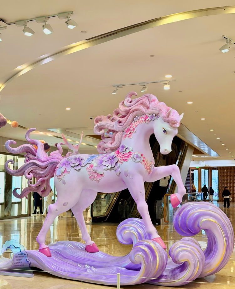 凌霄、織夢,兩匹神駿非凡、通體渲染粉紫霞光的大型藝術(shù)馬,已入駐德基廣場。根植于《山海經(jīng)》深度創(chuàng)作,喚醒公眾的文化記憶,拉開了融合觀賞、互動與傳播的立體化新春社交場域。