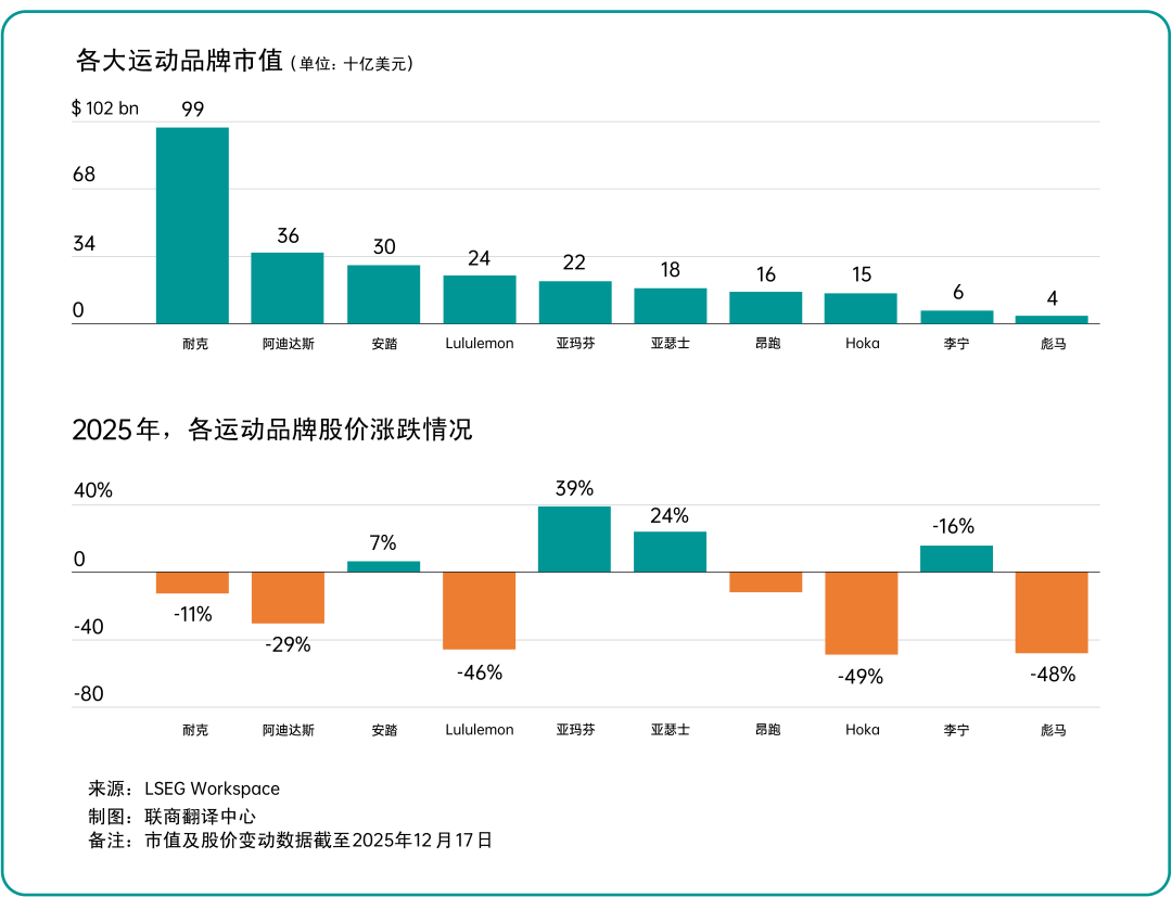 這一分化同樣反映在資本市場上。2025年以來,耐克、阿迪達(dá)斯股價(jià)整體承壓,而以中國和亞洲市場為重要增長來源的品牌表現(xiàn)明顯跑贏。