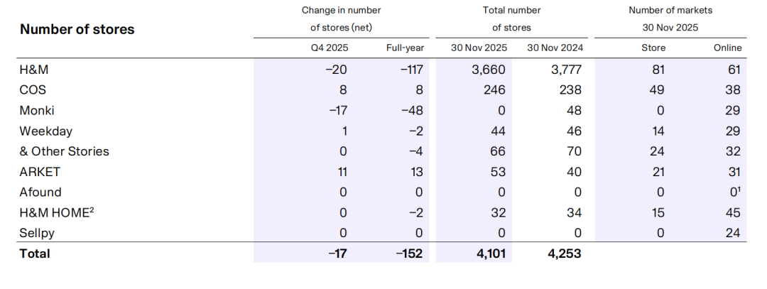 從門店數(shù)量來看,H&M集團2025年全年關(guān)閉152家門店,其中中國市場在內(nèi)的亞洲、大洋洲和非洲市場區(qū)域關(guān)閉105家門店。而從品牌來看,則主要集中在H&M品牌,2025年關(guān)閉117家門店。