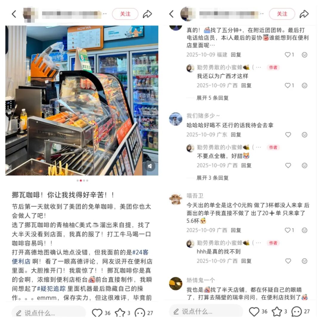 但當(dāng)他根據(jù)門店的地址去取餐時(shí),在周圍轉(zhuǎn)了好幾圈,始終沒有找到這家挪瓦咖啡。最后,無意間進(jìn)入一家便利店,終于在收銀臺(tái)處,看到了挪瓦的招牌:收銀臺(tái)的角落里,擺放著咖啡機(jī)等設(shè)備,與咖啡同處一個(gè)區(qū)域的,還有烤紅薯、關(guān)東煮等。