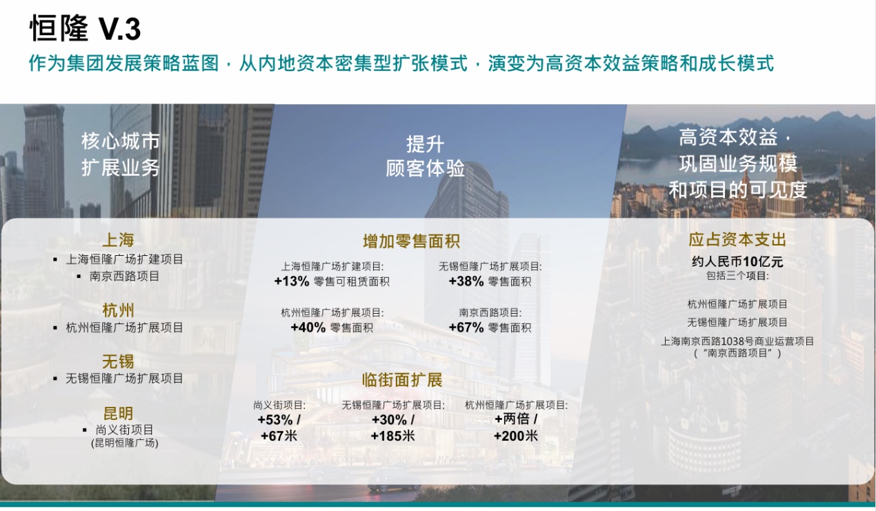 “V.3”策略是恒隆聚焦核心項目的精耕細作,面對市場飽和、競爭加劇及拿地成本高企的新環(huán)境,恒隆在“V.2”策略成功基礎(chǔ)上進行了升級。